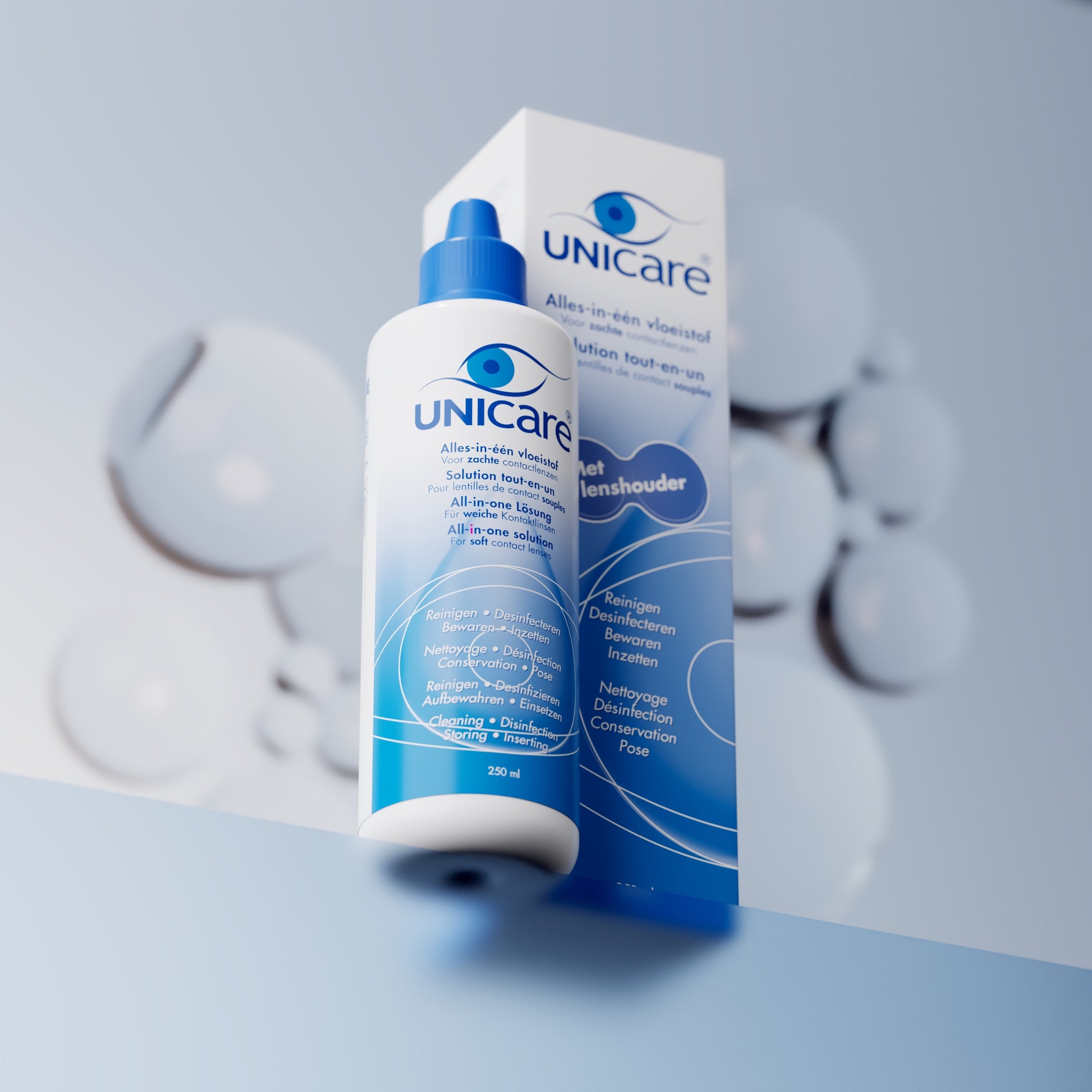 Unicare biedt complete en zachte verzorging voor alle soorten zachte contactlenzen. Eén vloeistof voor schoonmaken, desinfecteren, bewaren én inzetten. Dankzij de milde samenstelling met Poloxamer 407, NaCl en een minimale hoeveelheid PHMB (0,0001%) is deze vloeistof bijzonder geschikt voor gevoelige ogen.
